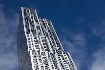 高达265米(870呎)的纽约盖瑞项目,是西半球最高的住宅大厦。波浪形的不锈钢幕墙与曼哈顿经典的摩天大厦相映成趣。建筑物外墙的不同立面随着日光光线的转移,变幻出不同的景致。
