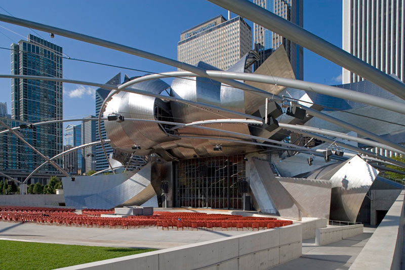 蓋瑞運用雕塑式的頂篷設計,為芝加哥千禧公園營造了既有遮蓋頂篷而又有出人意料的音響效果的戶外音樂廳。不銹鋼製的「綢帶」橫跨主觀眾席,形成了120呎闊(37米)的前舞臺,讓7,000名聽眾在緩坡草地上優閒地享受音樂。